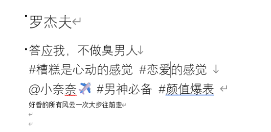 document.add_heading('答应我,不做臭男人#糟糕是心动的感觉 #恋爱的感觉 @小奈奈✈️ #男神必备 #颜值爆表 ', level=2)